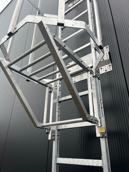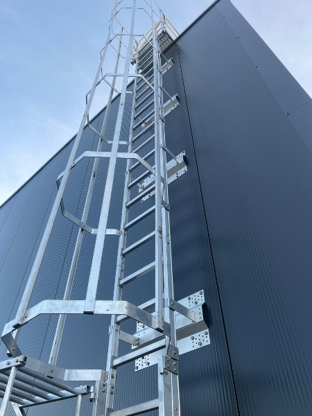 Conception aux Normes en Vigueur : Cette échelle est un dispositif d'accès technique réalisé dans le strict respect des normes de sécurité (notamment la norme NF E 85-016). Chaque élément, de l'espacement des échelons à la géométrie de la cage, est calculé pour garantir une protection anti-chute optimale.